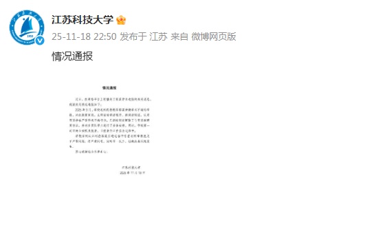 据“江苏科技大学”官方微博,学校将网络平台流传的郭某学术造假相关消息通报如下:2025年9月,学校接到我校教师郭某涉嫌诬告的举报,高度重视,立即启动调查程序。经调查取证,认定郭某犯有严重学术诬告罪。按照规定与郭某签订了聘用协议,对其师生团队进行了妥善安排。同时,学校立即向公安机关报案,目前案件正在进一步侦办中。学校深刻认识到郭引进过程中存在材料评估不严等问题,严肃追责并借鉴从一个例子来防止问题的发生。衷心感谢社会各界的关心。江苏科技大学 2025 年 11 月 18 日 上一篇:小账本藏大情怀 下一篇:没有了