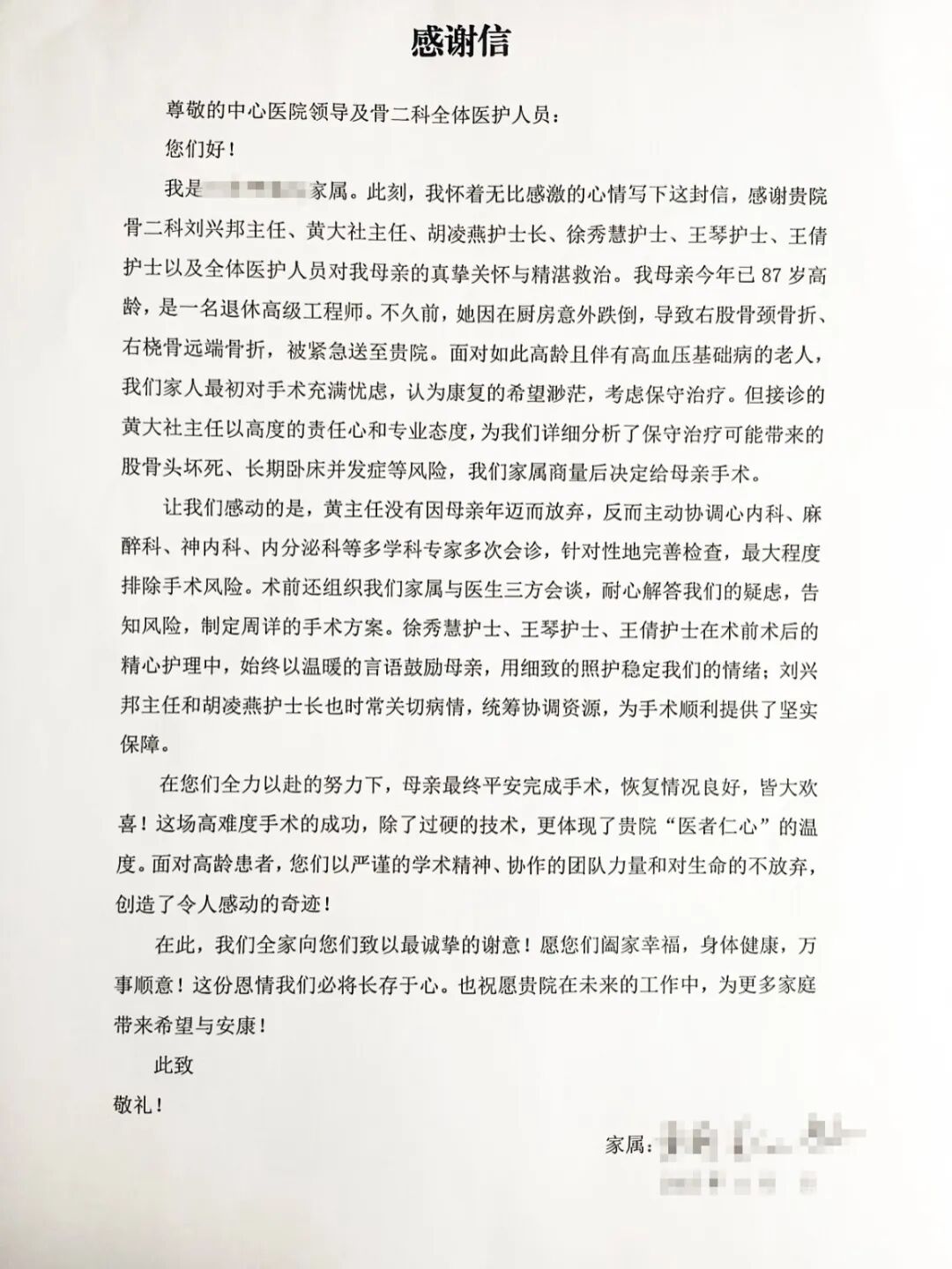 “你们让我87岁的母亲重新站了起来,让她在这里感受到了家的温暖。这份恩情我们全家人都会铭记在心!”近日,李奶奶(化名)带着家人精神抖擞地从潜江市中心医院出来。临行前,家属向医护人员致以衷心的感谢信。